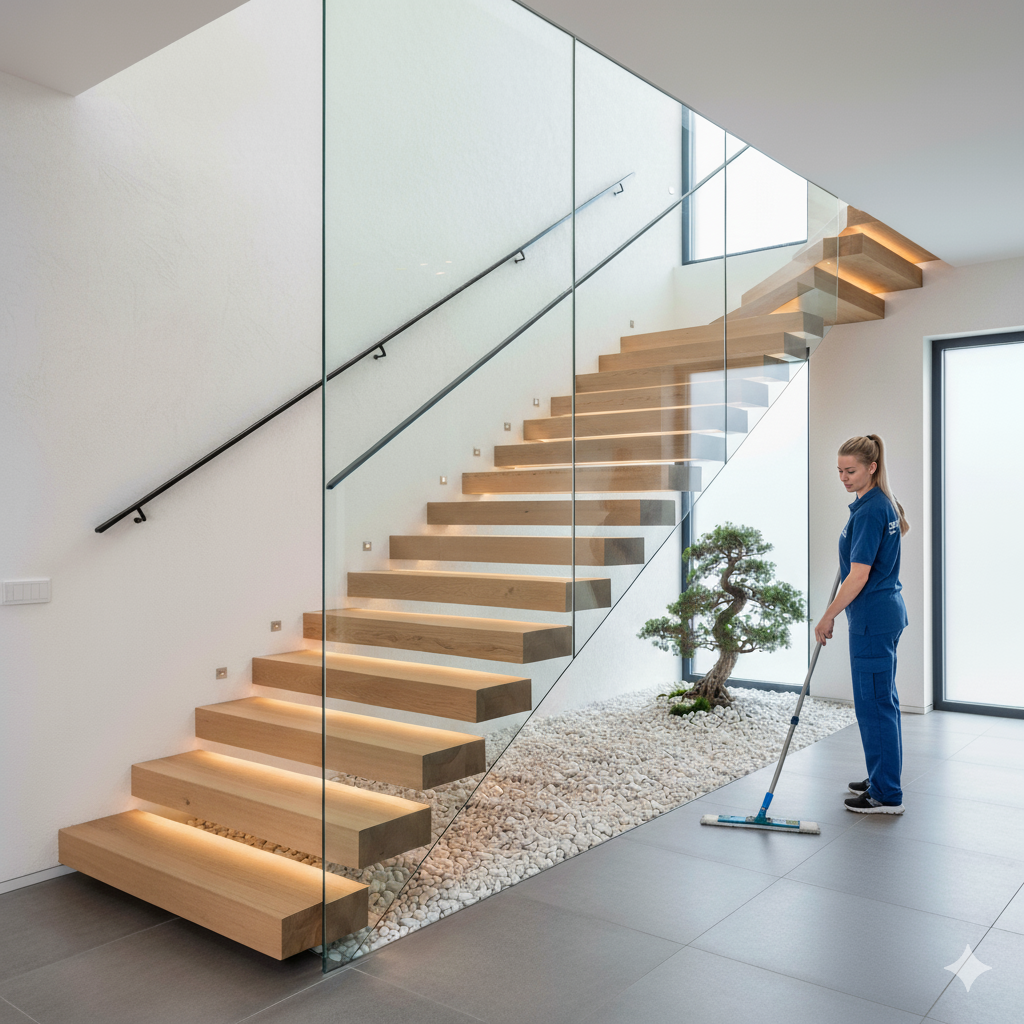Gründliche Pflege und Reinigung von Treppenhaus und Boden für dauerhaft saubere und gepflegte Flächen.